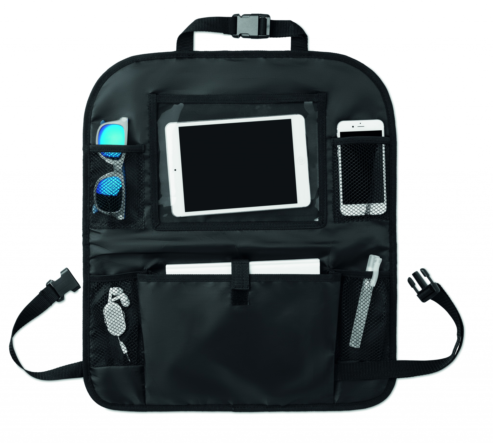 Organizer für das Auto. Einfach an der Rücklehne zu befestigen. Diverse Fächer. 420D Polyester.