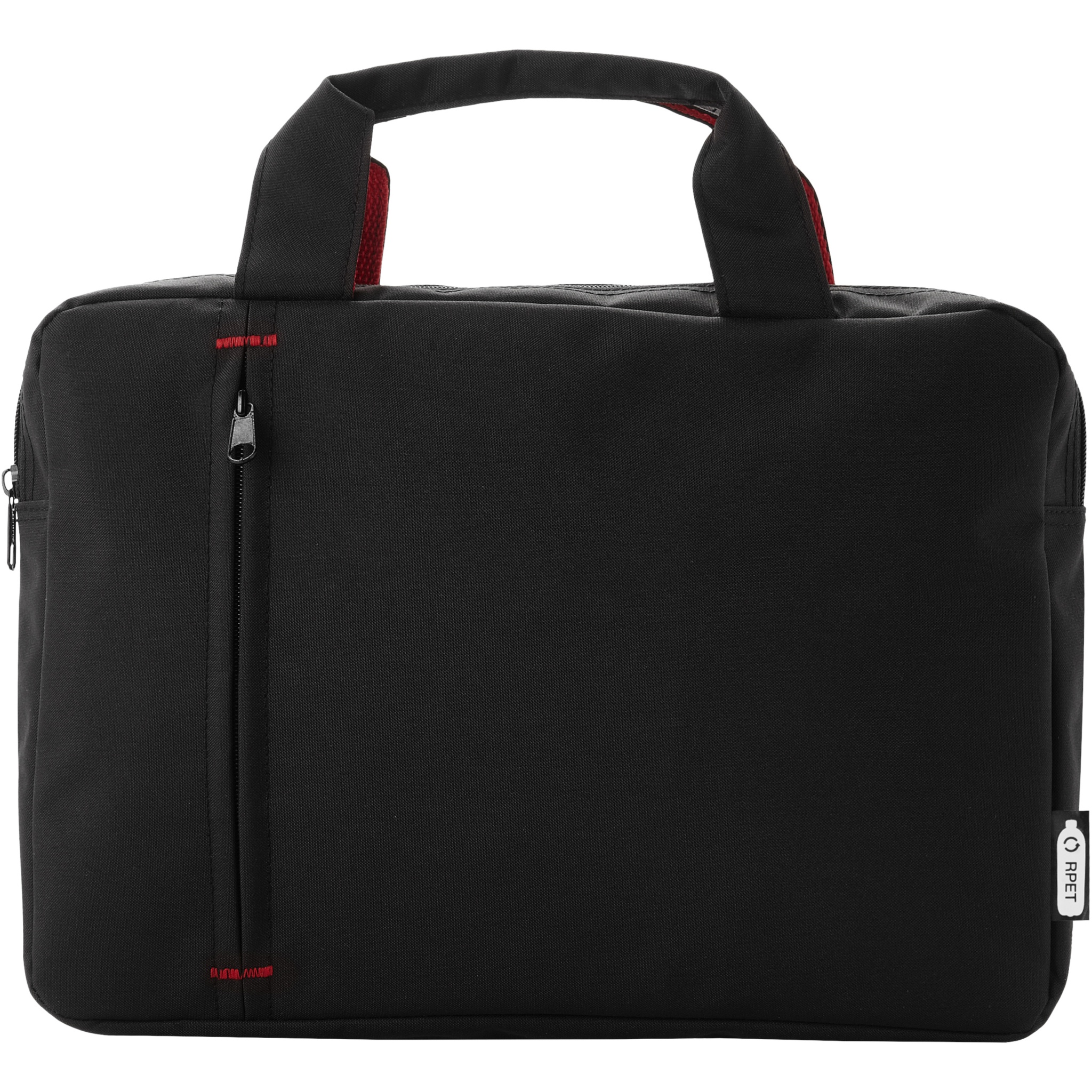 Konferenztasche aus recyceltem PET Kunststoff mit einem Hauptfach mit Reißverschluss und einer Reißverschlusstasche auf der Vorderseite, mit verstärkten Tragegriffen an der Oberseite und trendigen farblichen Kontrastelementen.