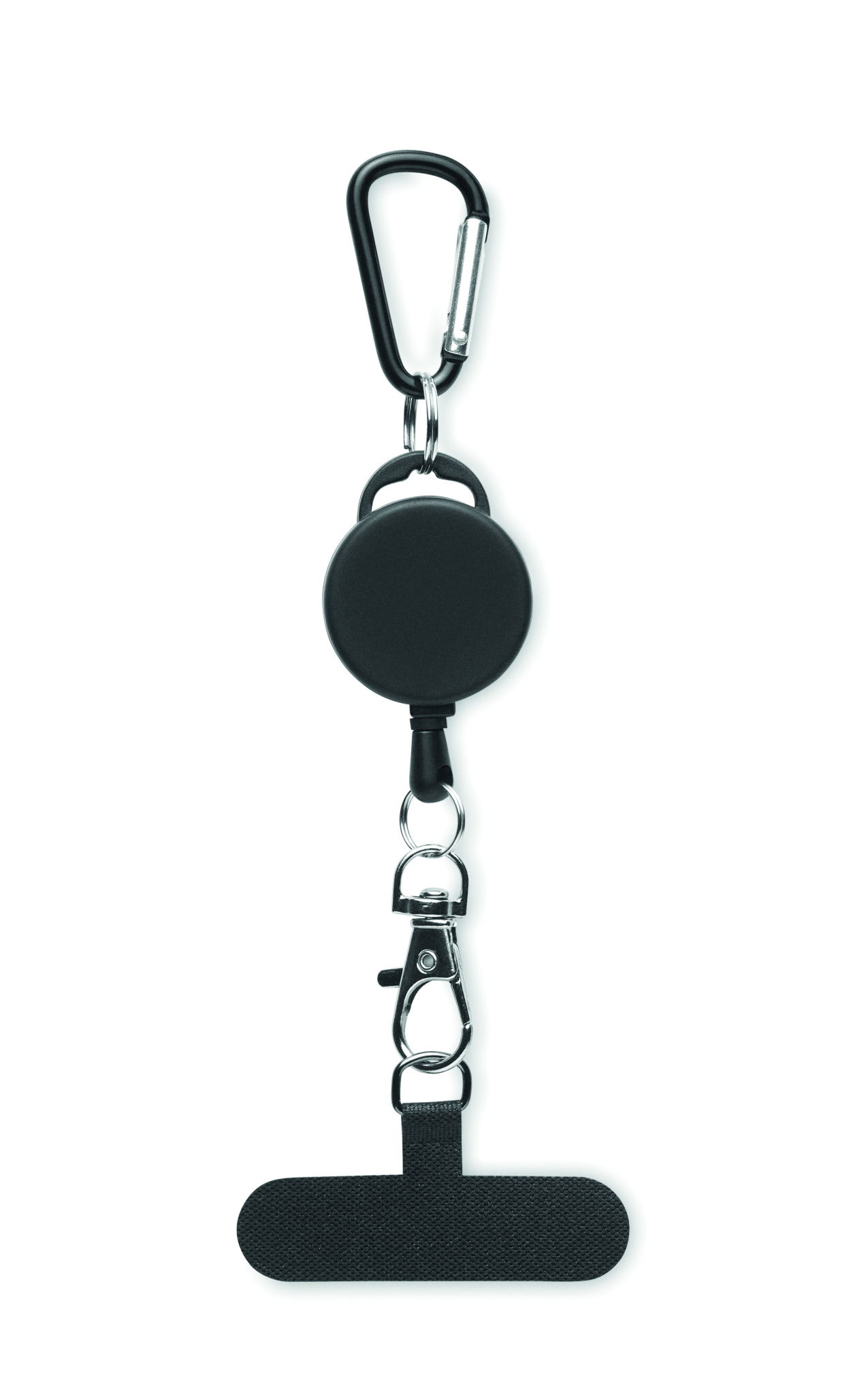 Einziehbarer Smartphone-Halter/Ausweishalter aus ABS mit Karabiner aus Aluminium. Mit Universalhalter. Der Karabiner ist NICHT als Sicherung beim Klettern geeignet.