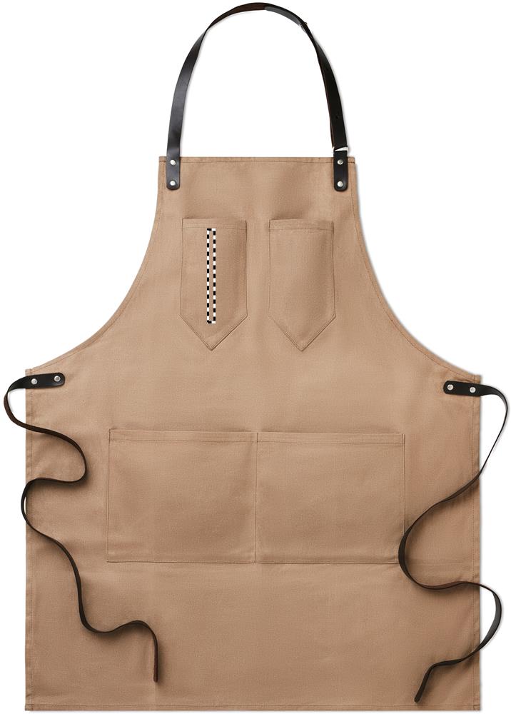 Schürze aus gewachstem Canvas. Verstellbarer Nackengurt sowie Bindegurt aus Leder. 2 Brusttaschen und eine große Fronttasche.