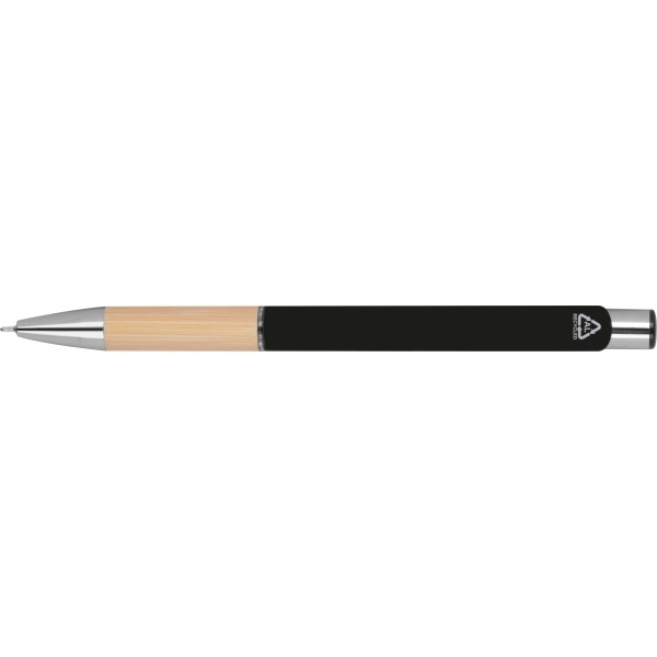 Semi-Gelstift aus recyceltem Aluminium mit gummierter Oberfläche. Er verfügt außerdem über eine Bambus-Griffzone, eine blau schreibende Kunststoffmine (0,5 mm Spitze) und silberne Akzente.