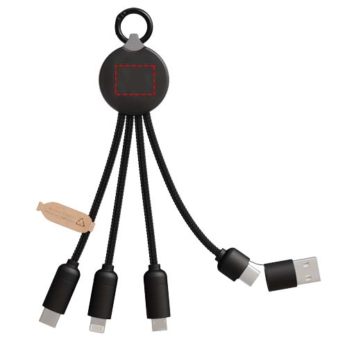 5-in-1 Ladekabel mit 3 Anschlüssen (Typ-C, Android, iPhone) und rPET-Kabeln (hergestellt aus recycelten Kunststoffflaschen). Der duale USB-A- und USB-C-Eingang macht das Kabel 100% kompatibel mit den neuesten Computermodellen (USB-C). Endkappen in Metalloptik. Das Kabel kann bis zu 3 Geräte gleichzeitig aufladen. Geliefert in einer recyclebaren Hülle und einer Karte aus recyceltem Papier.