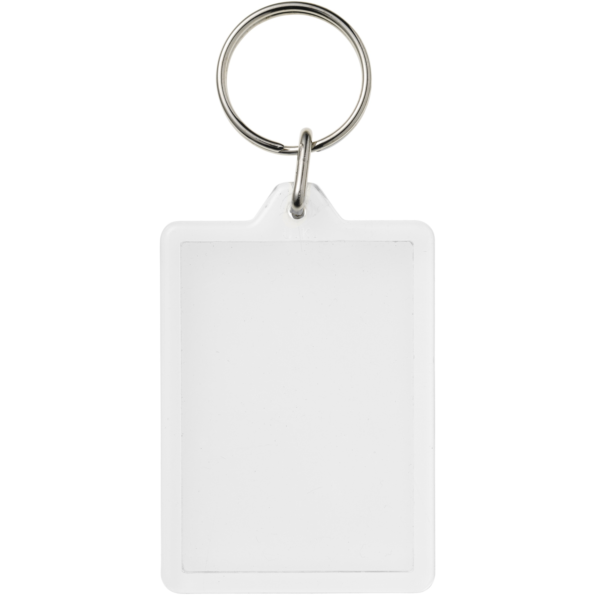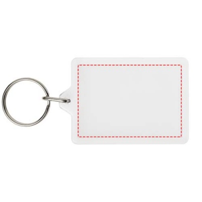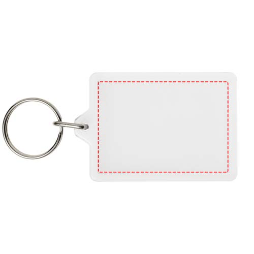 Transparenter, rechteckiger C1-Schlüsselanhänger mit metallenem Schlüsselring. Der Metallring bietet ein flaches Profil, das sich ideal für Mailings eignet. Abmessungen der Druckeinlage: 5,0 cm x 3,5 cm.