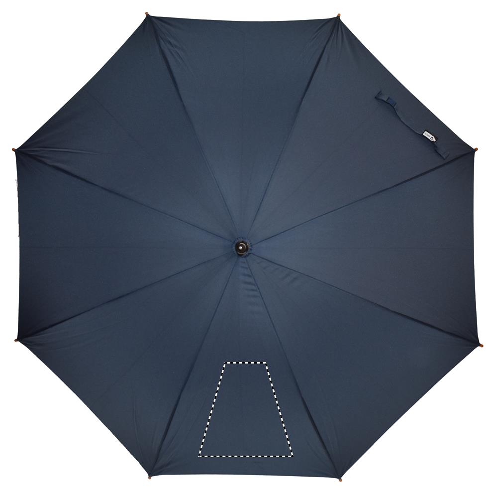 23 inch auto open umbrella in 190T RPET pongee with wooden shaft, tips and top. Black plated metal ribs. Curved natural finish wooden handle. Manual closure.