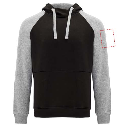 Two-colour unisex hoodie. Hood with crossed neck and metal eyelets. Contrasting inner hood, drawcord and raglan sleeves. Kangaroo pocket. Cuffs and hem in 1x1 elastane rib knit. Removable label.