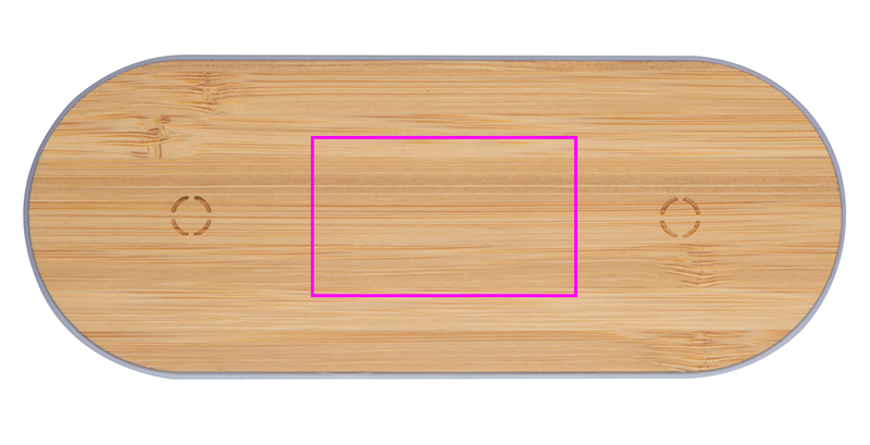 Slim plastic charging station with bamboo surface and two induction charging points for smartphones, including a charging cable. Your logo will be engraved on the station.