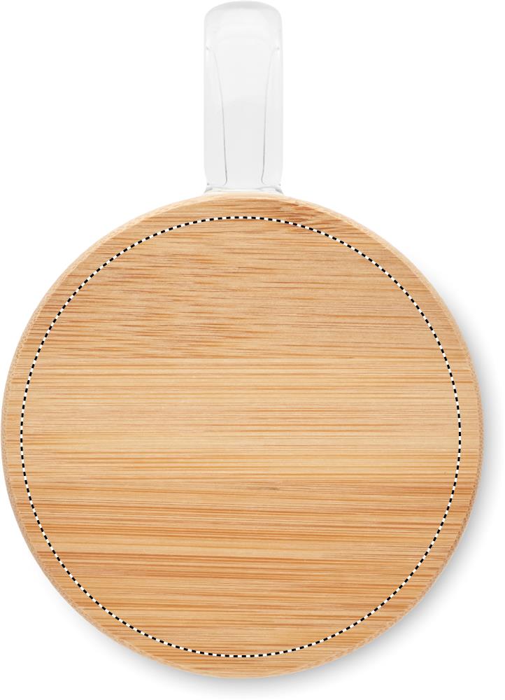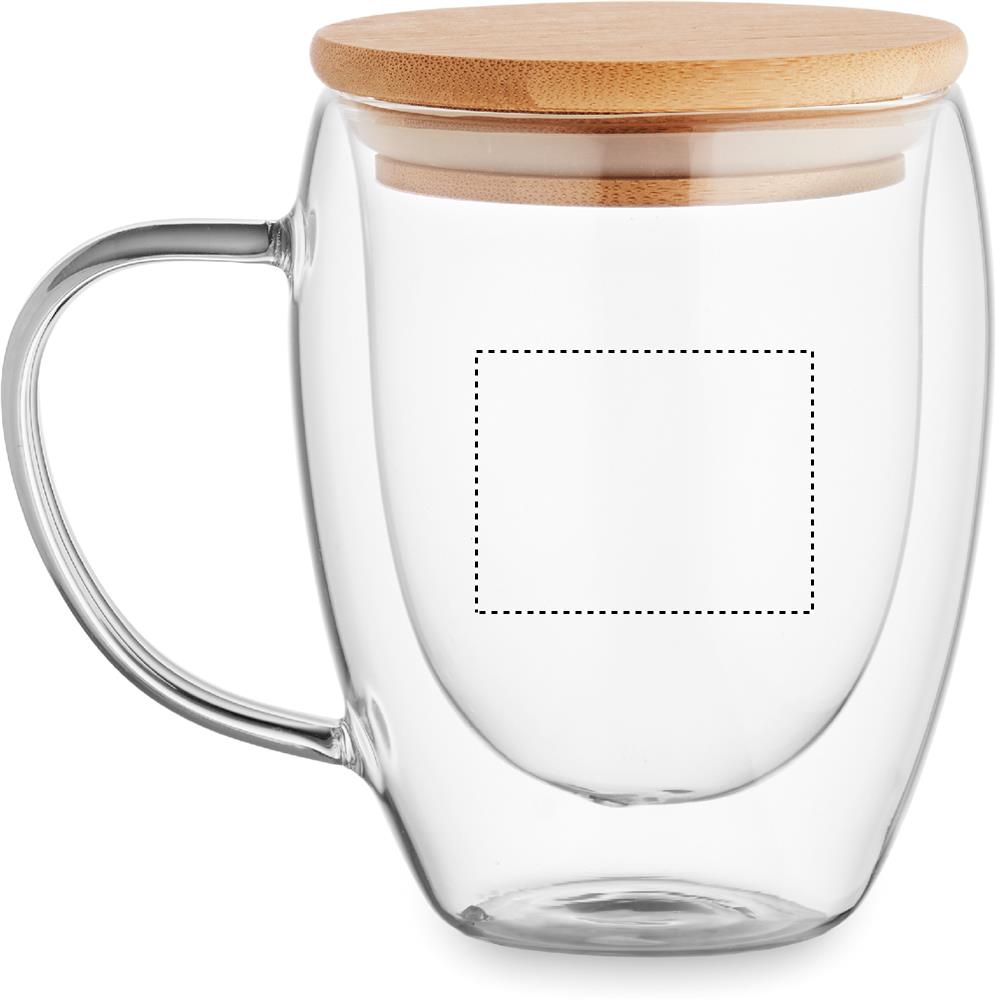 Double wall borosilicate glass mug with handle and bamboo lid. Capacity: 250 ml.