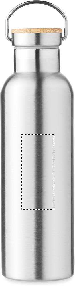 Double wall Stainless Steel insulating vacuum flask with bamboo lid and carry handle. Capacity: 750 ml. Leak free. Bamboo is a natural product, there may be slight variations in colour and size per item, which can affect the final decoration outcome.
