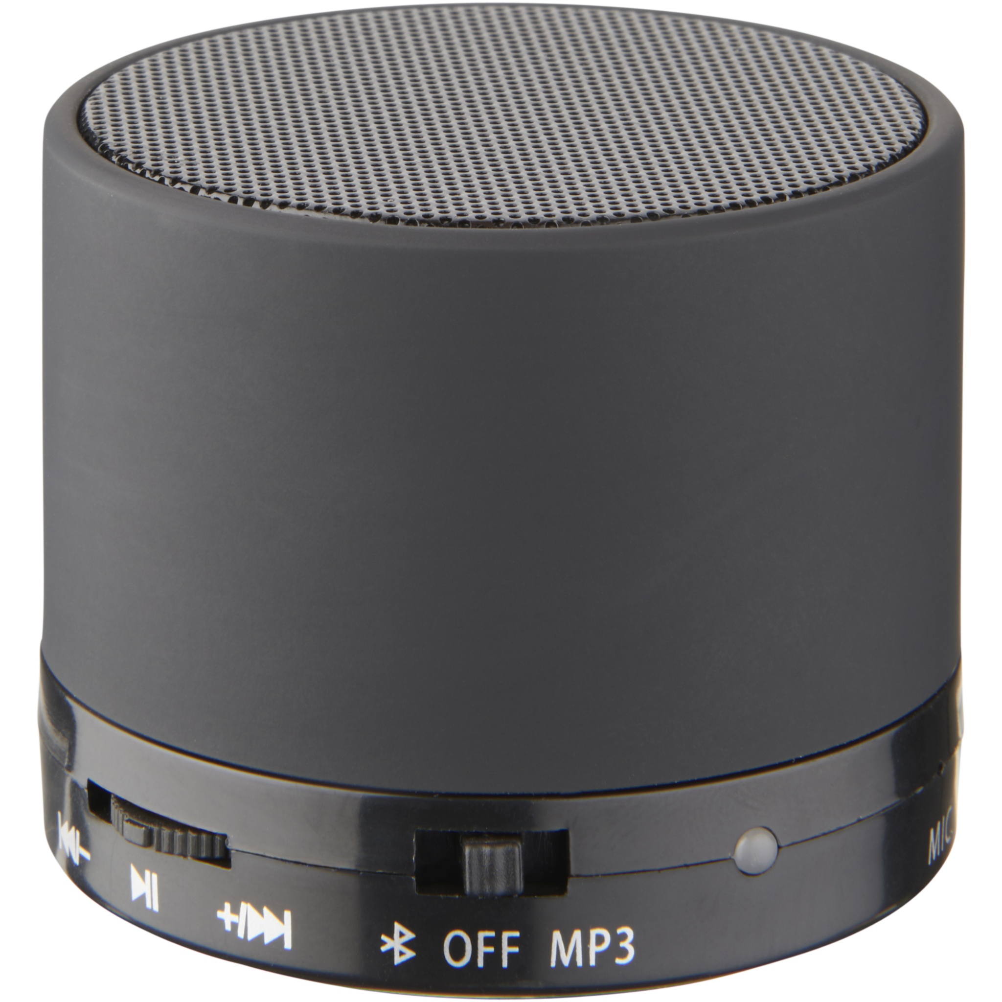 Rubber cylinder speaker. Enjoy music and movies anywhere by pairing your Bluetooth® compatible device like iPhone, iPad or Android OS devices with this portable Bluetooth® speaker (10M range). With the built in microphone, the speaker allows you to conference call on the go through your smartphone or by video chat programs like Skype. Comes with a nice rubberized finish. USB power supply included. .