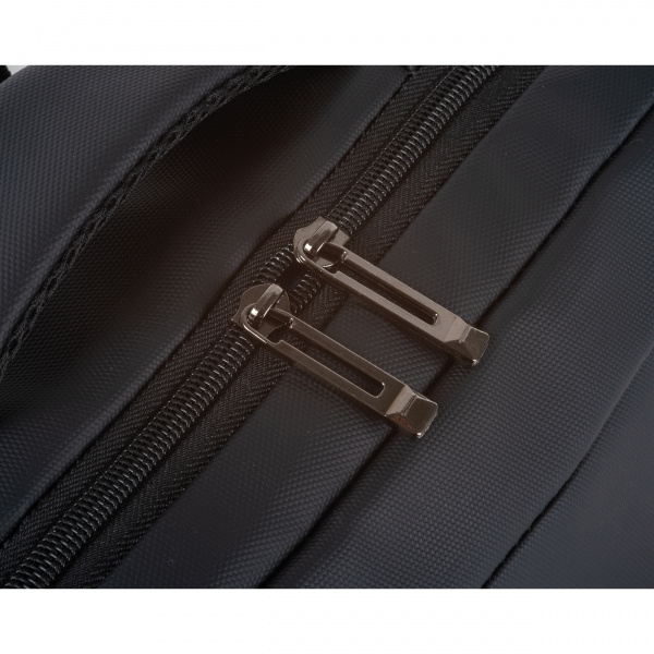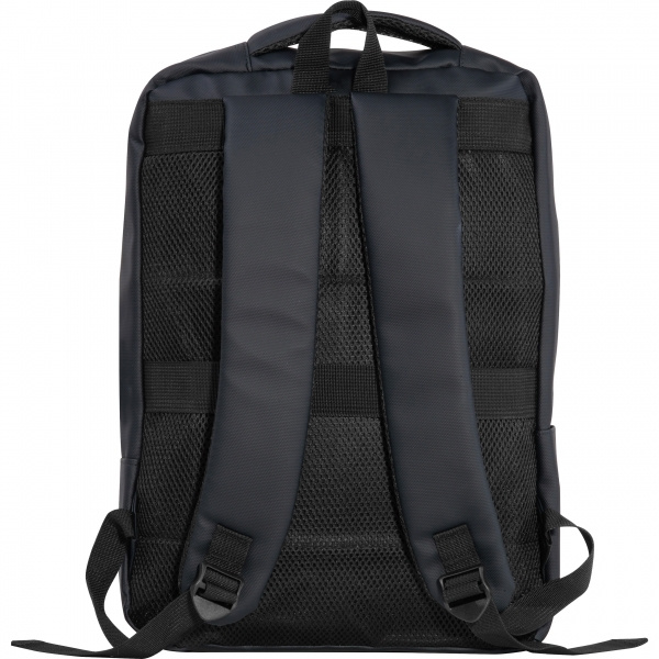 Laptop backpack made of PU for 15–16 inch laptops. It features two zippered front compartments, a large main compartment with padding for the laptop, various inner slip pockets, padded shoulder straps, a carrying handle, and a strap on the back for attaching to a trolley. Your logo is applied to the front compartment.