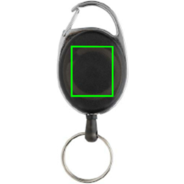 Roller clip keychain made with RCS recycled ABS and zinc alloy. Ideal item for office, trade show or even when skiing. With 60cm cord to attach badge for easy access. With carabiner hook to attach to bag or clothing. Total recycled content: 34% based on total item weight. RCS certification ensures a completely certified supply chain of the recycled materials. Packed in paper bag.