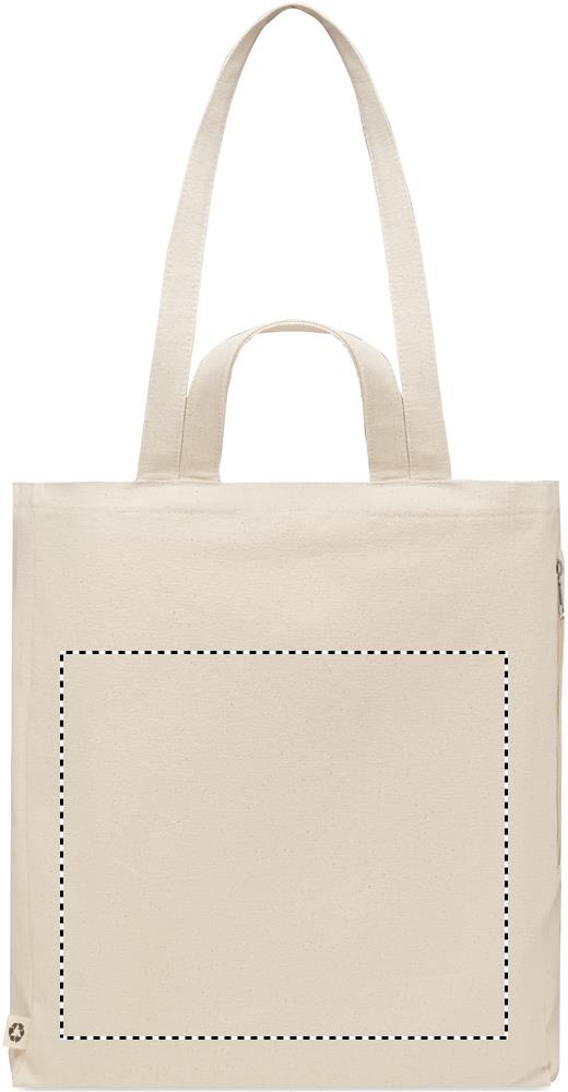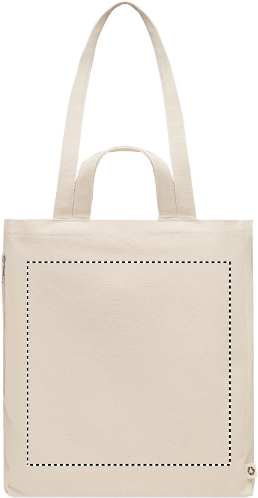 Recycled polycotton shopping or beach bag (70% recycled cotton, 30% recycled polyester) with short handles. It has a side zippered pocket. 380 gr/m².
