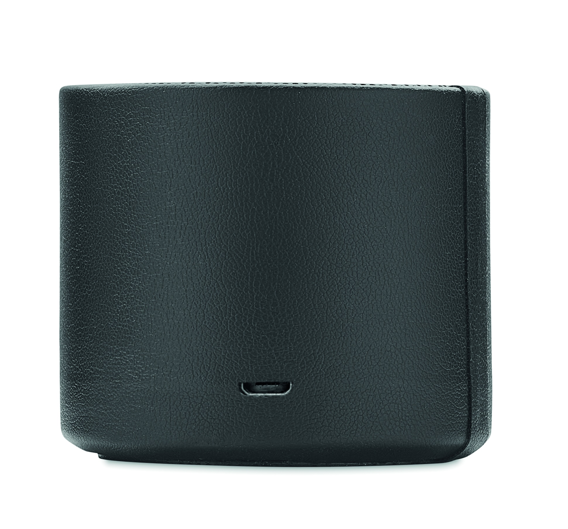 5.0 wireless speaker with casing in ABS and PU which is 58% recycled (40% recycled polyester and 18% recycled PU) and LED light indication. Output data: 3W, 3 Ohm and 5V. Playing time approx. 3h.