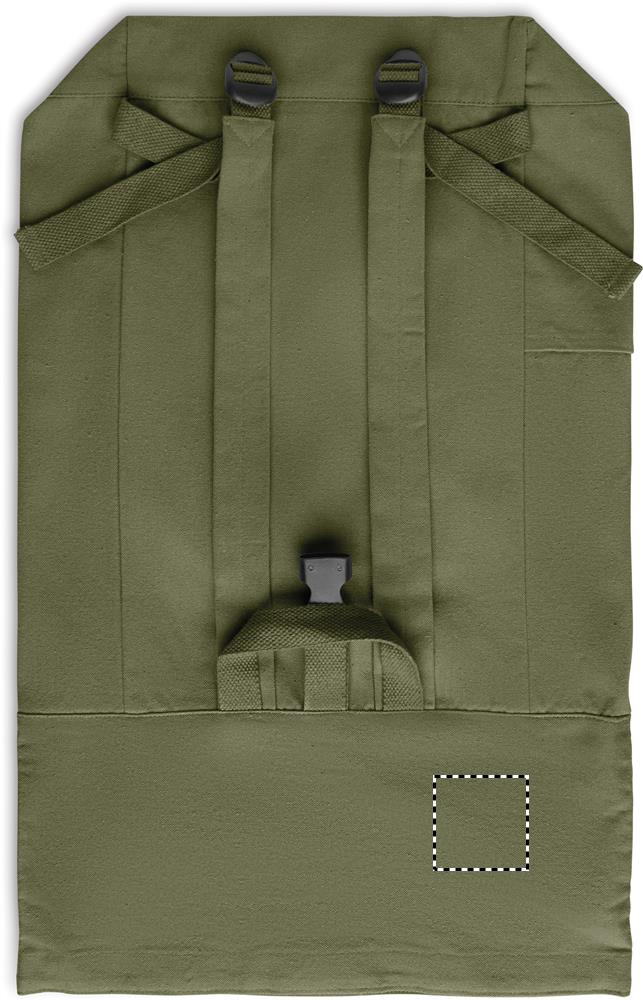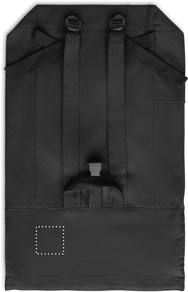 Roll top backpack with hook and loop closure in 390 gr/m² recycled cotton (80%) and recycled polyester (20%). Zippered front pocket.