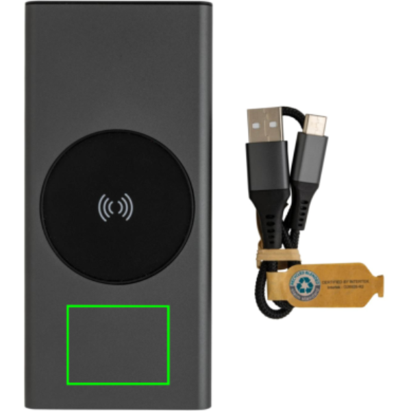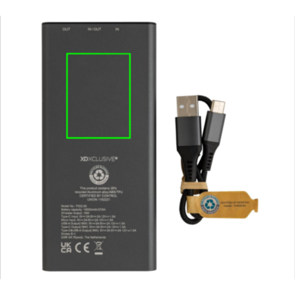 Ultra-fast charging powerbank made with RCS (Recycled Claim Standard) certified recycled aluminium and ABS. Total recycled content: 28% based on total item weight. RCS certification ensures a completely certified supply chain of the recycled materials. Aluminium does not lose its characteristics in the recycling process and can be recycled endlessly. The powerbank contains a long-lasting grade A 10.000 mAh lithium polymer battery. The C output port supports fast charging up to 18W and also fast re-charging within 3 hours. The wireless charger supports wireless charging up to 10W. The power indicators will indicate the remaining energy level so you always know when to re-charge. Item and accessories 100% PVC free. Including type C charging cable made from RCS certified recycled aluminium, TPE and PET. Packed in FSC® mix packaging. USB output 5/3A, 9V/2A. 12V/1.5A. Type C output: 5V/3A, 9V/2A, 12V/1.5A. Type C input: 5V/3A, 9V/2A, 12V/1.5A. Micro USB input: 5V/2A, 9V/2A, 12V/1.5A.