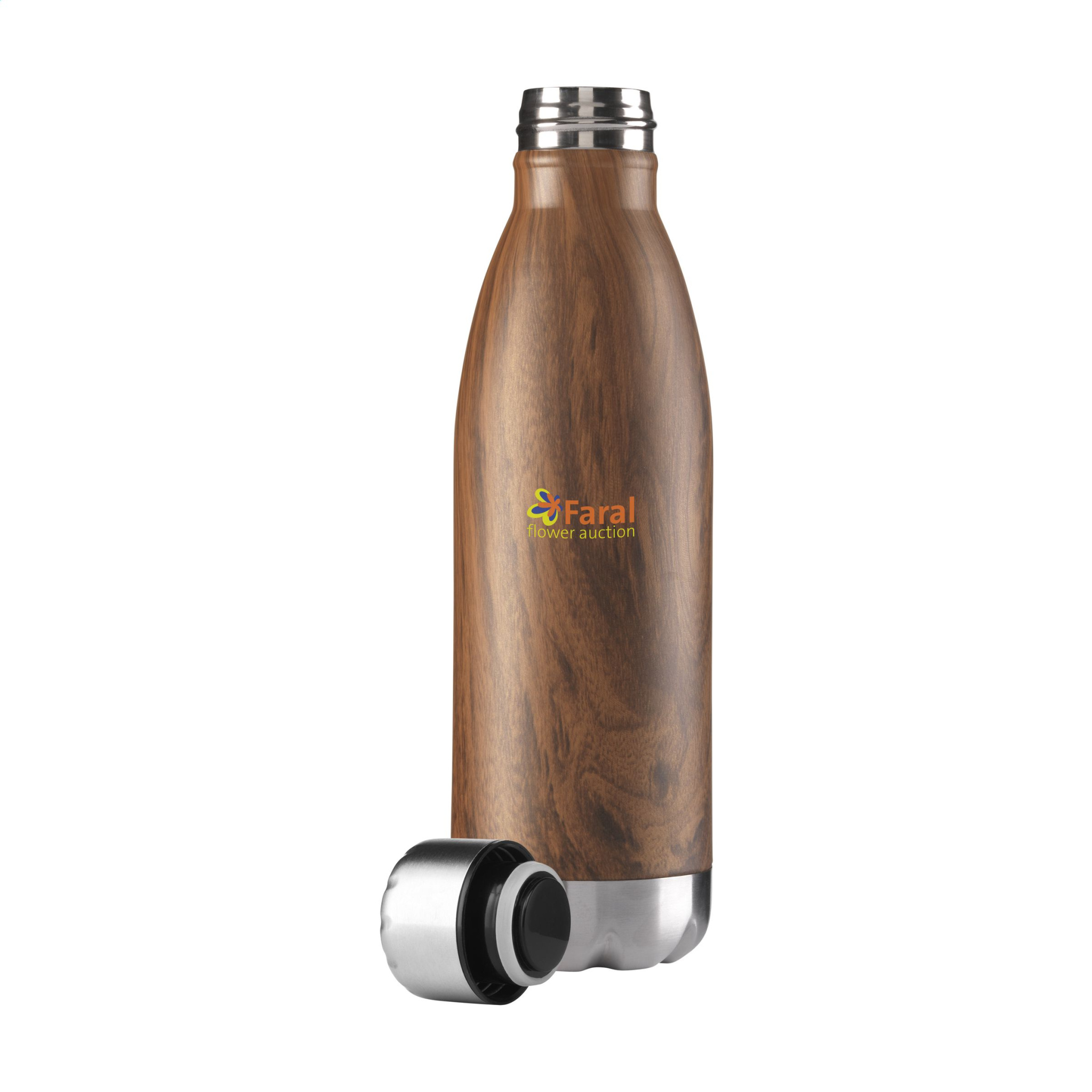 Double-walled, vacuum-insulated, stainless steel water bottle. With leakproof screw top. This elegant model has a striking, attractive top layer with a wood grain pattern. Suitable for maintaining the temperature of cold or hot water. Capacity 500 ml. Each item is individually boxed.