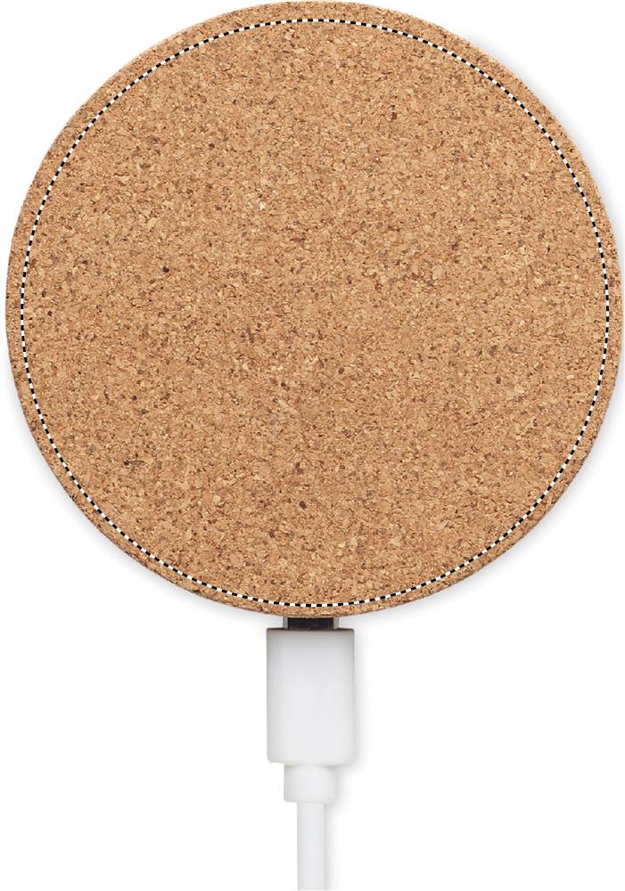 Round shape cork wireless charger. Output: DC 9V/1.1A (10W). Compatible with iPhone® 8 and newer. Cork is 100% natural material. Due to its structural nature and surface porosity the final print result per item may have deviations.