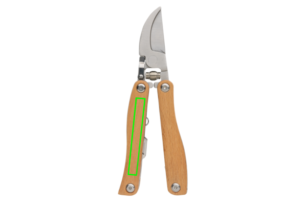 Garden multi-tool made with FSC 100% beech wood, high hardness and corrosion resistant stainless steel (420). Rockwell hardness 42-52. The item comes with 10 functions: Garden pruning shears, Lock, Flat screwdriver, File, Root remover, Knife, Shovel, Saw, Weed remover hook, Weeding tool. Packed in FSC mix kraft box.
