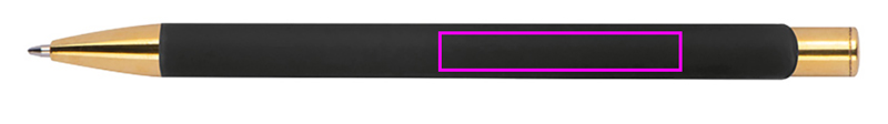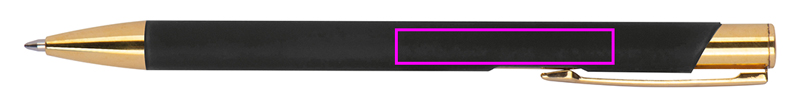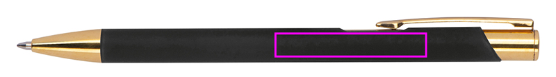 Alumiiniumist pastapliiats, millel on kuldsed aplikatsioonid, kummiviimistlus ja sinise kirjaga suure mahutavusega täidis. Teie logo lastakse klipi paremale küljele, see kuvatakse kuldse värviga.