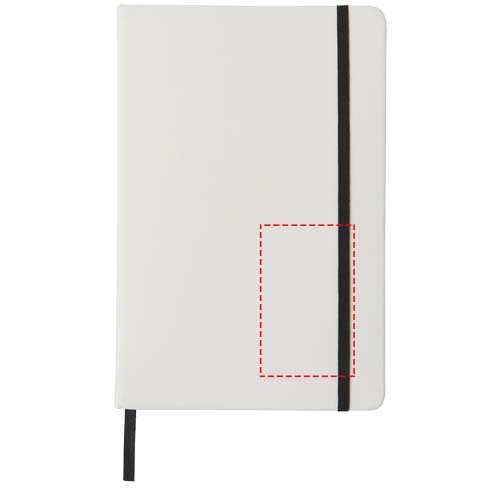 Valge A5 märkmik värvilise elastse kinnise ja paelaga. Sisaldab 80 lehte (60g/m2) joonega paberit. Kaanele võimalik digitrükk.