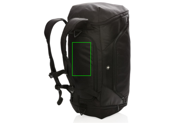 Kerge 1680D ja 600D polüester 2-in-1 kott. Töötab nii seljakotina kui ka seljakotina. Sisaldab mahukat U-kujulise ülemise tõmblukuga põhisahtlit, külgmist jalatsite või määrdunud riiete sahtel ja külgmist lukuga taskut. Tagaküljel pudelihoidja tasku ja kiire juurdepääsutasku. Ees lukuga tasku 2 RFID-kaitsega varrukaga. Reguleeritavad õlarihmad mugavuse ja mitmekülgsuse tagamiseks. PVC vaba.