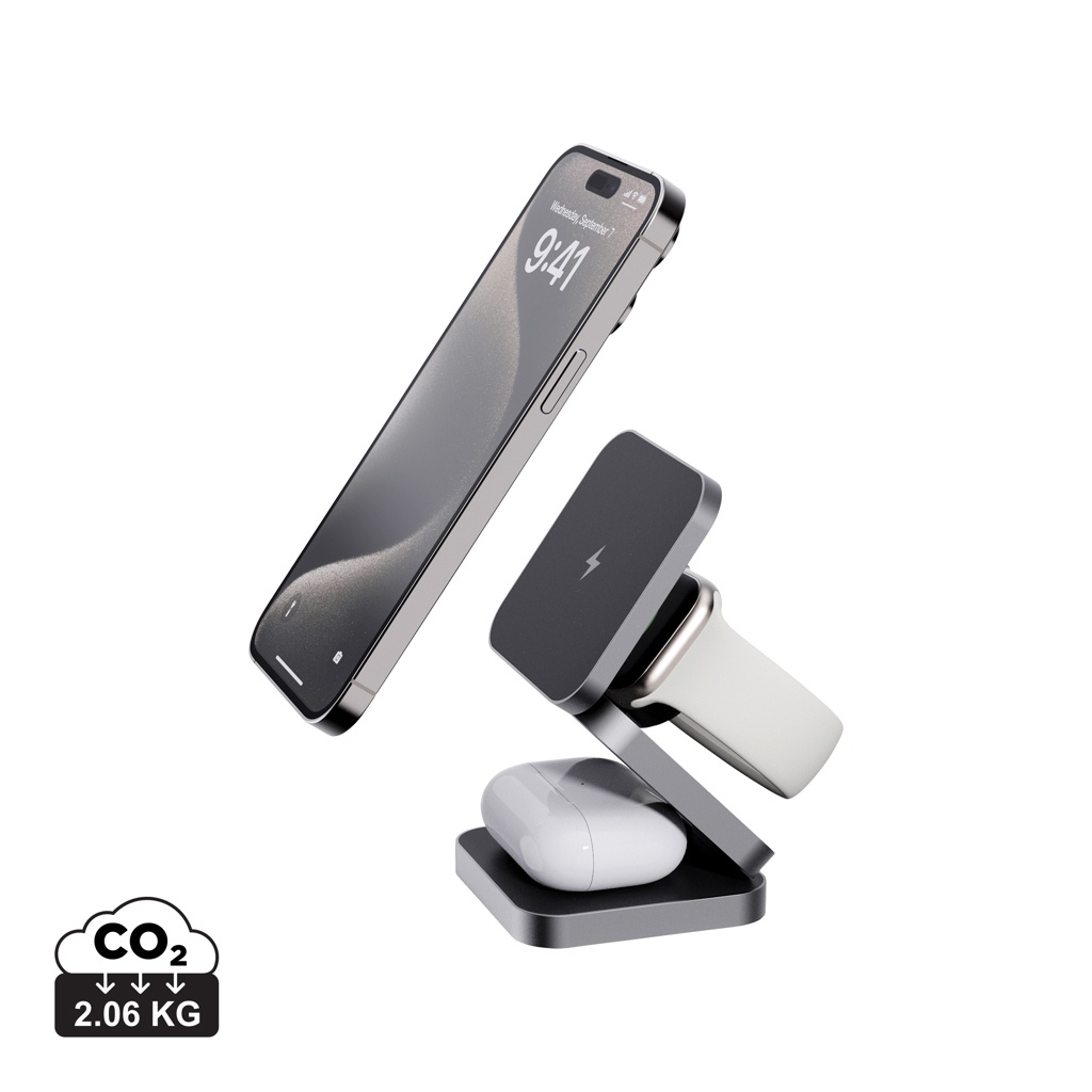 Luksuslik ja kokkupandav kolm-ühes juhtmevaba laadija, mis on valmistatud RCS-i ringlussevõetud ABS-ist ja RCS-i ringlussevõetud alumiiniumist. Taaskasutatud kogusisaldus: 46% eseme kogukaalust. RCS-sertifikaat tagab taaskasutatud materjalide täielikult sertifitseeritud tarneahela. Juhtmeta laadija on varustatud magnetilise 15 W juhtmevaba laadija ja täiendava 5 W juhtmevaba laadijaga, mis sobib kõrvaklappide või muude väikeste juhtmevabade laetavate seadmete jaoks ning 2,5 W juhtmevaba laadijaga nutikellade jaoks (ainult Apple'i kellad). Sisaldab RCS-sertifikaadiga 120 cm taaskasutatud TPE-kaablit. Pakitud FSC® mix kraft pakendisse. Toode ja tarvikud 100% PVC-vaba. Sisend: 9V/3A optimaalseks kasutamiseks. Väljund: Telefon: 9V/1.1A; 9V/1,67 A/(15W), kõrvaklapid: 5V/1A (5W), käekell: 5V/0,5A. PVC vaba.