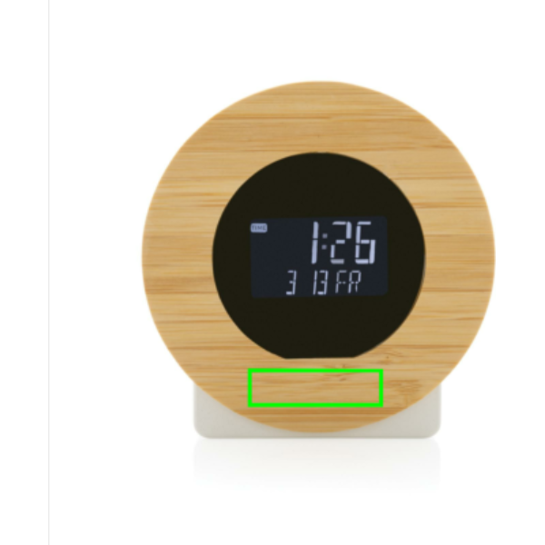 Lauakell valmistatud RCS (Recycled Claim Standard) sertifitseeritud taaskasutatud ABS-ist ja FSC® 100% bambusest. Taaskasutatud kogusisaldus: 66% kauba kogukaalust. RCS-sertifikaat tagab taaskasutatud materjalide täielikult sertifitseeritud tarneahela. LCD ekraaniga. Funktsioonid: Kell ja äratuskell. Kaasa arvatud 100 cm C-tüüpi kaabel, mis on valmistatud RCS-sertifikaadiga taaskasutatud TPE-st. Pakitud FSC® mix kraft karpi.