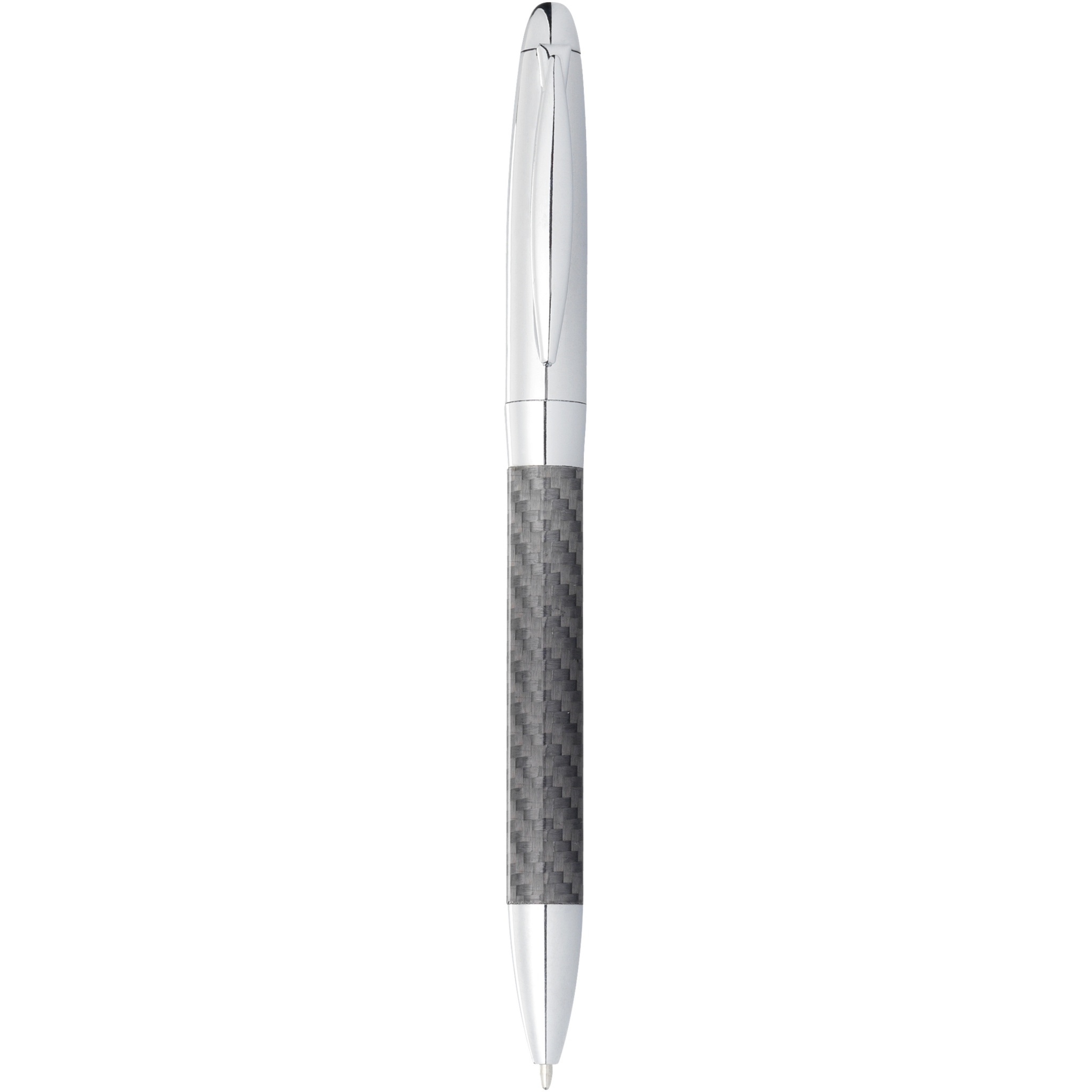 Klassikalise disainiga kuulipunkt läikiva ülemise silindri ja süsinikkiust detailidega alumisel torul. Sealhulgas silindriga kinkekarp.