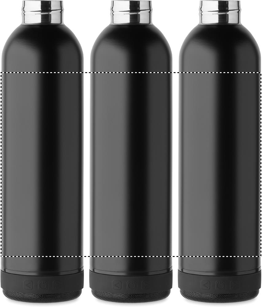 Kaksiseinäinen tyhjiöeristetty pullo kierrätetystä ruostumattomasta teräksestä (90 % kierrätettyä ruostumatonta terästä ja 10 % ruostumatonta terästä) ja silikoninen kantokahva, jossa on irrotettava 3 W langaton kaiutin. Tilavuus: 500 ml. 500 mAh akku. Vuotamaton.