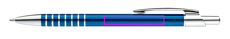 Ohut metallikuulakynä, jossa sinikirjoitustäyttö ja kaiverrettu otealue. Kaivertamme logosi klipsien alle.