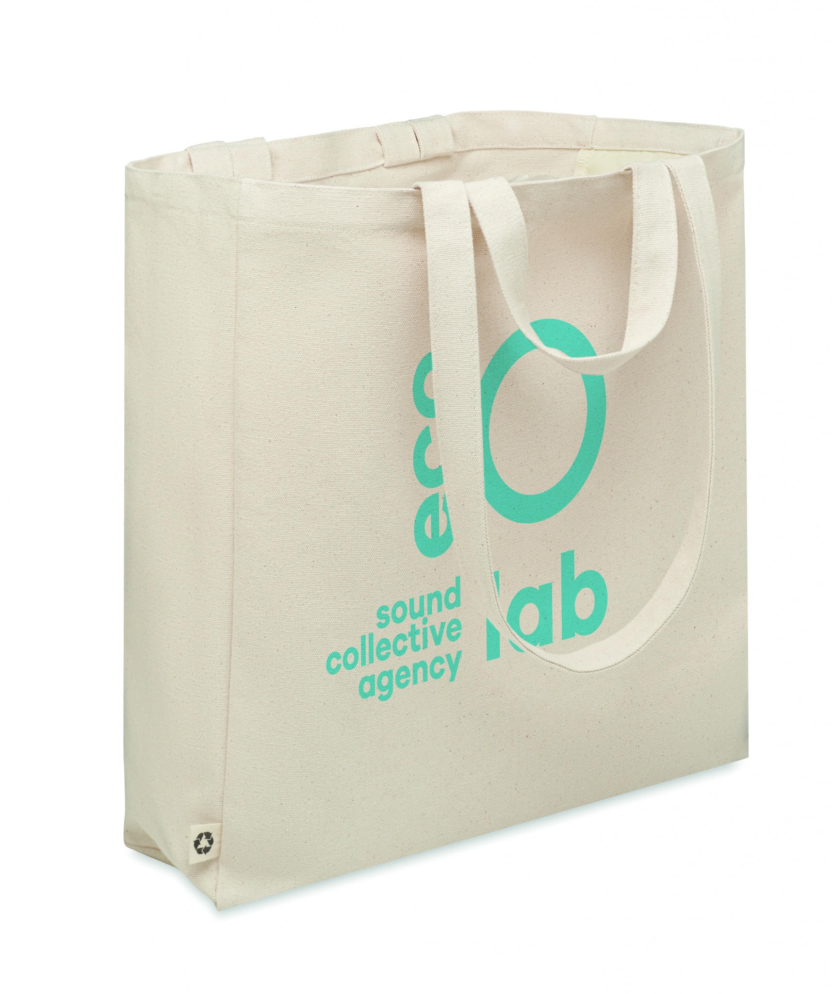 Kierrätysmateriaalista valmistettu ostos- tai rantakassi lyhyillä kantokahvoilla. Kassissa on vetoketjullinen sivutasku. Materiaali 70 % kierrätettyä puuvillaa/ 30 % kierrätettyä polyesteriä, 380 gr/m².