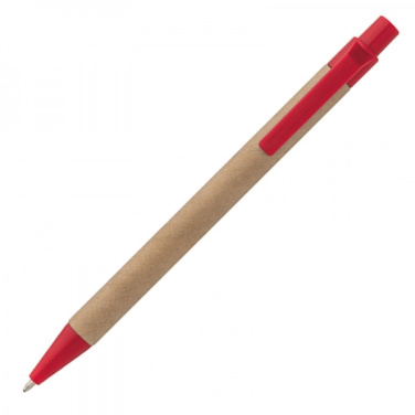 Kierrätyspaperista ja värillisistä muovisovelluksista valmistettu kuulakärkikynä, sininen kirjoitus. Logosi on painettu leikkeen oikealle puolelle.