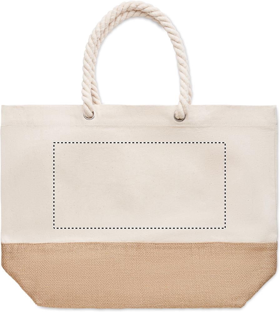 Ranta- tai ostoskassi, jossa on narukahva ja juuttiyksityiskohdat. Materiaali 280 gr/m²canvas.