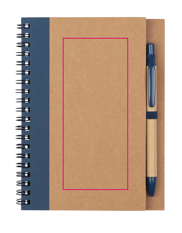Kierresidottu vihko, jossa on 120 kierrätyspaperista valmistettua tyhjää sivua (kansi 250 gsm, sivut 60 gsm) ja kynälenkki. Mukana tulee kierrätyspaperista valmistettu kuulakärkikynä, jossa on ei-vaihdettava sinikirjoitustäyttö ja ABS-muovikoroste.