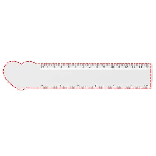 Sydämenmuotoinen kiinteä kierrätysmuoviviivain, jossa merkinnät tuumina tai senttimetreinä.