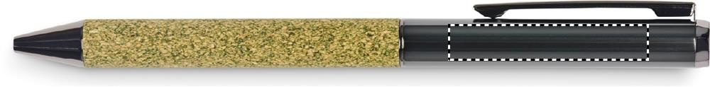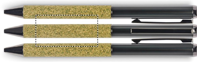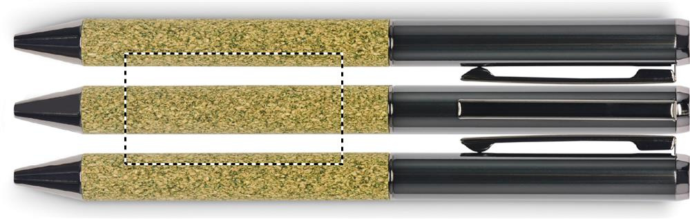 Metallinen kuulakärkikynä, jonka runko on valmistettu seoksesta 20% teenporoja, 30% korkkia ja 50% polyesteripuuvillaa. Pahvilaatikossa. Sininen muste.