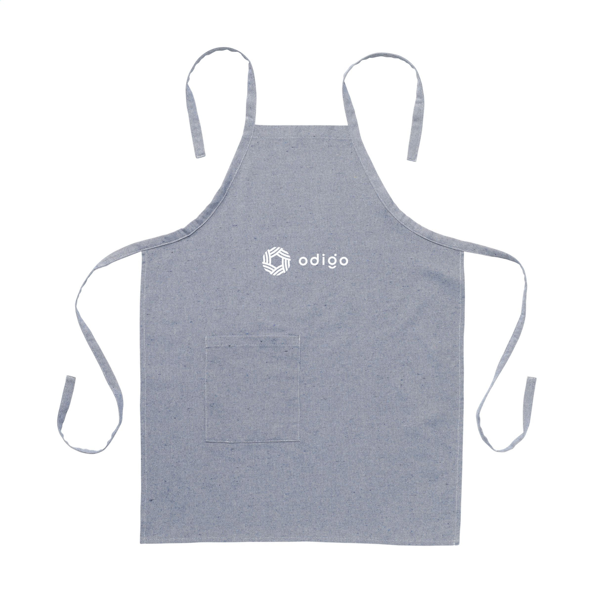 Esiliina paikkataskulla hollantilaiselta Wolkat-merkiltä. Valmistettu vanhoista ja käytöstä poistetuista vaatteista, kuluttajien lahjoittamat Hollannissa. Wolkatilla he hallitsevat koko prosessia keräyksestä, lajittelusta, kierrätyksestä, kehräyksestä ja kutomisesta - kaikki saman katon alla. Koko tekstiilien kierrätysprosessin aikana ei käytetä vettä, maalia tai kemikaaleja. Wolkat silppuaa ja kuiduttaa nämä tekstiilit puhtaiksi kuiduiksi, jotka sitten lähetetään omaan kehräämään, joka sijaitsee Marokossa. Tässä kehrässä kehrätään eripaksuisia ja -laatuisia lankoja. Tästä valmistetaan tuotteita, kuten tämä esiliina, joka koostuu 52 % kierrätetyistä tekstiileistä ja 48 % RPET:stä.