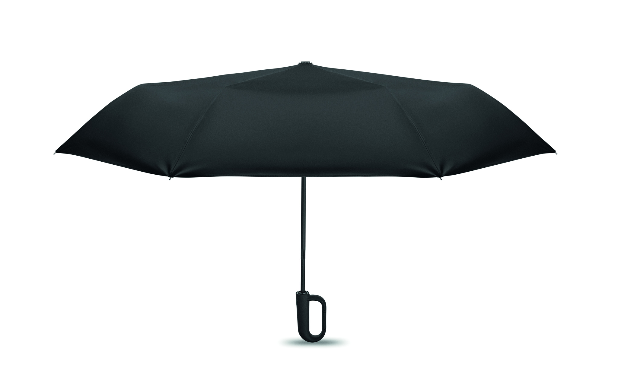 Salokāms 21 collu vēja necaurlaidīgs lietussargs ar pilnībā melnu stiklšķiedras rāmi ar 2 sekcijām. Stiklšķiedras ribas. 190T RPET pongee paneļi. D formas karabīnes rokturis ar gumijas apdari. Automātiska atvēršana un aizvēršana. Komplektā iekļauta kabata.