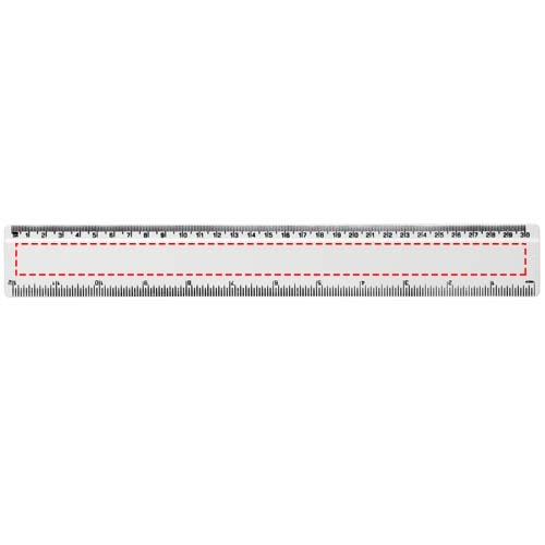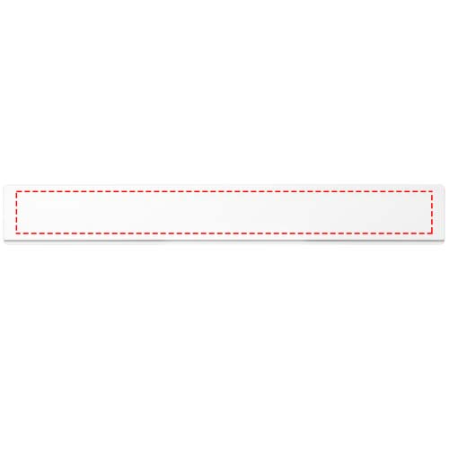 Ciets, pārstrādātas plastmasas lineāls ar marķējumu, kas pieejams gan collās, gan centimetros.