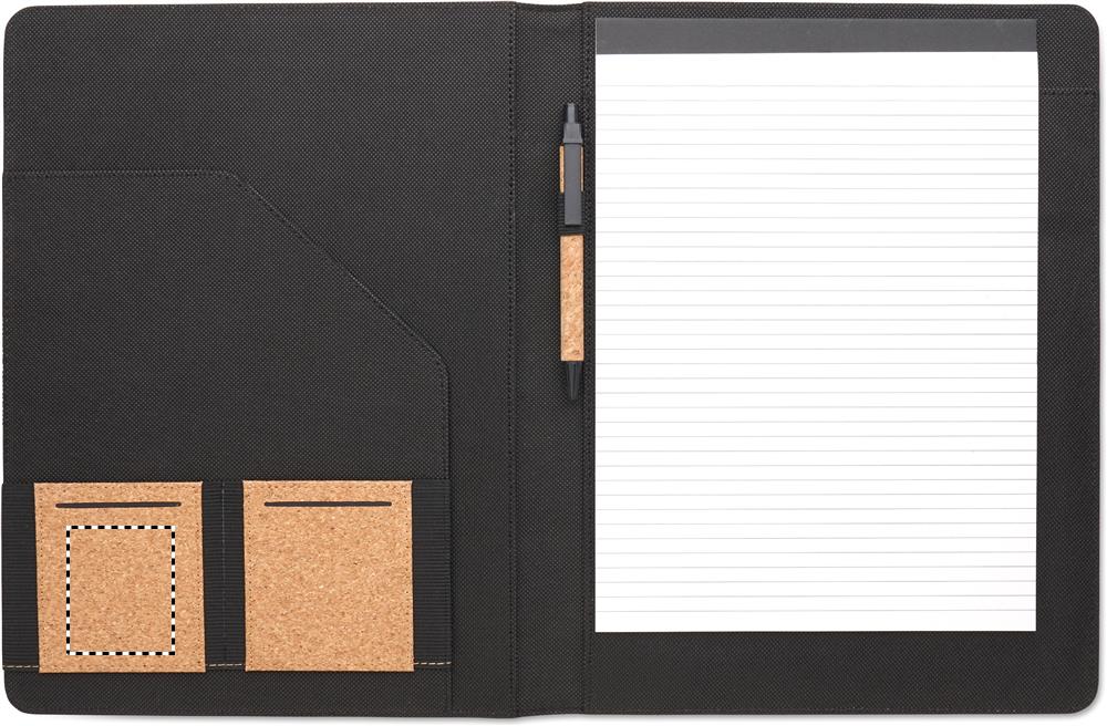 Папка для конференций из пробки формата А4. Блокнот формата А4. 30 линованных листов из переработанной бумаги. Ручка шариковая. 2 держателя для карт и одно большое отделение.