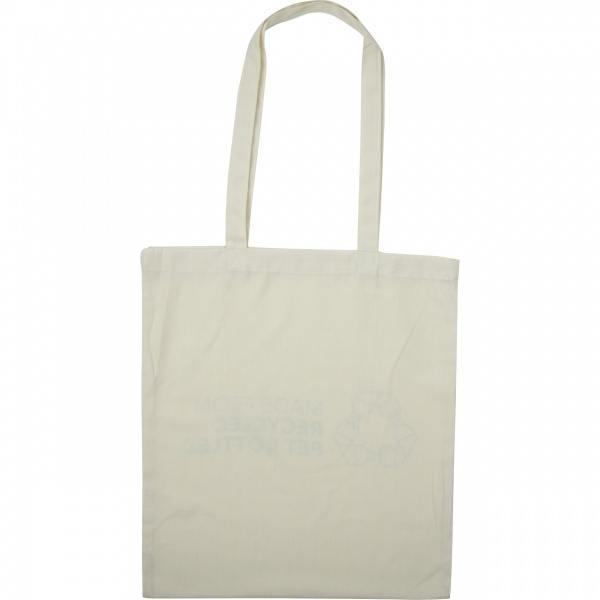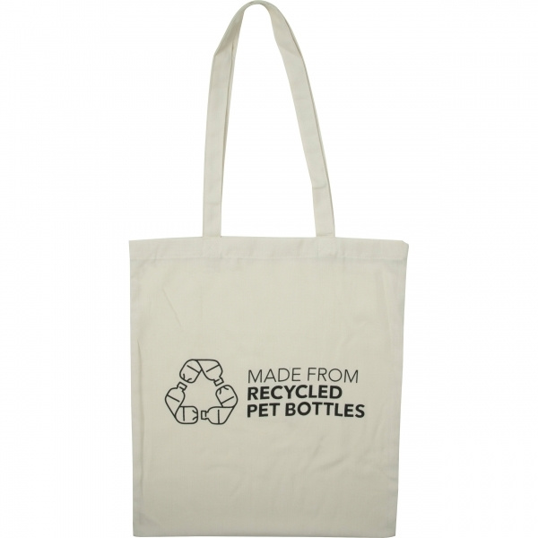 Многоразовая сумка-тоут из переработанного материала RPET, с постоянным логотипом `MADE FROM RECYCLED BOTTLES` на одной стороне. Другая сторона предлагает достаточно места для вашего фирменного стиля. Экологичная, прочная и идеальный рекламный предмет!