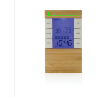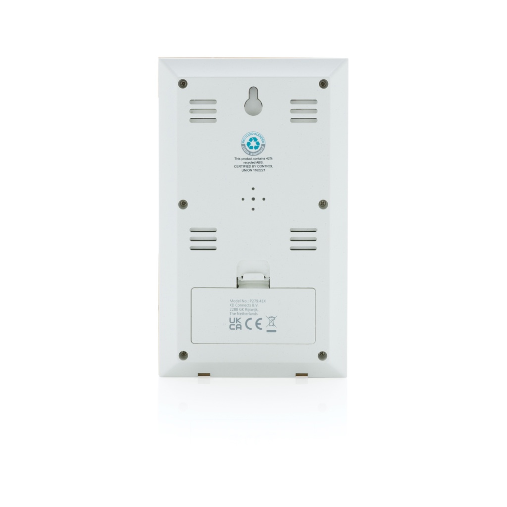 Метеостанция изготовлена из переработанного АБС-пластика, сертифицированного по стандарту RCS (Recycled Claim Standard), и бамбука FSC® 100%. Общее содержание переработанных материалов: 42 % от общего веса изделия. Сертификация RCS гарантирует полностью сертифицированную цепочку поставок переработанных материалов. С ЖК-экраном. Функции: температура, влажность, время, день недели, дата, температура. В комплект входят батарейки типа ААА для непосредственного использования. Упаковано в коробку из крафт-бумаги FSC® mix.