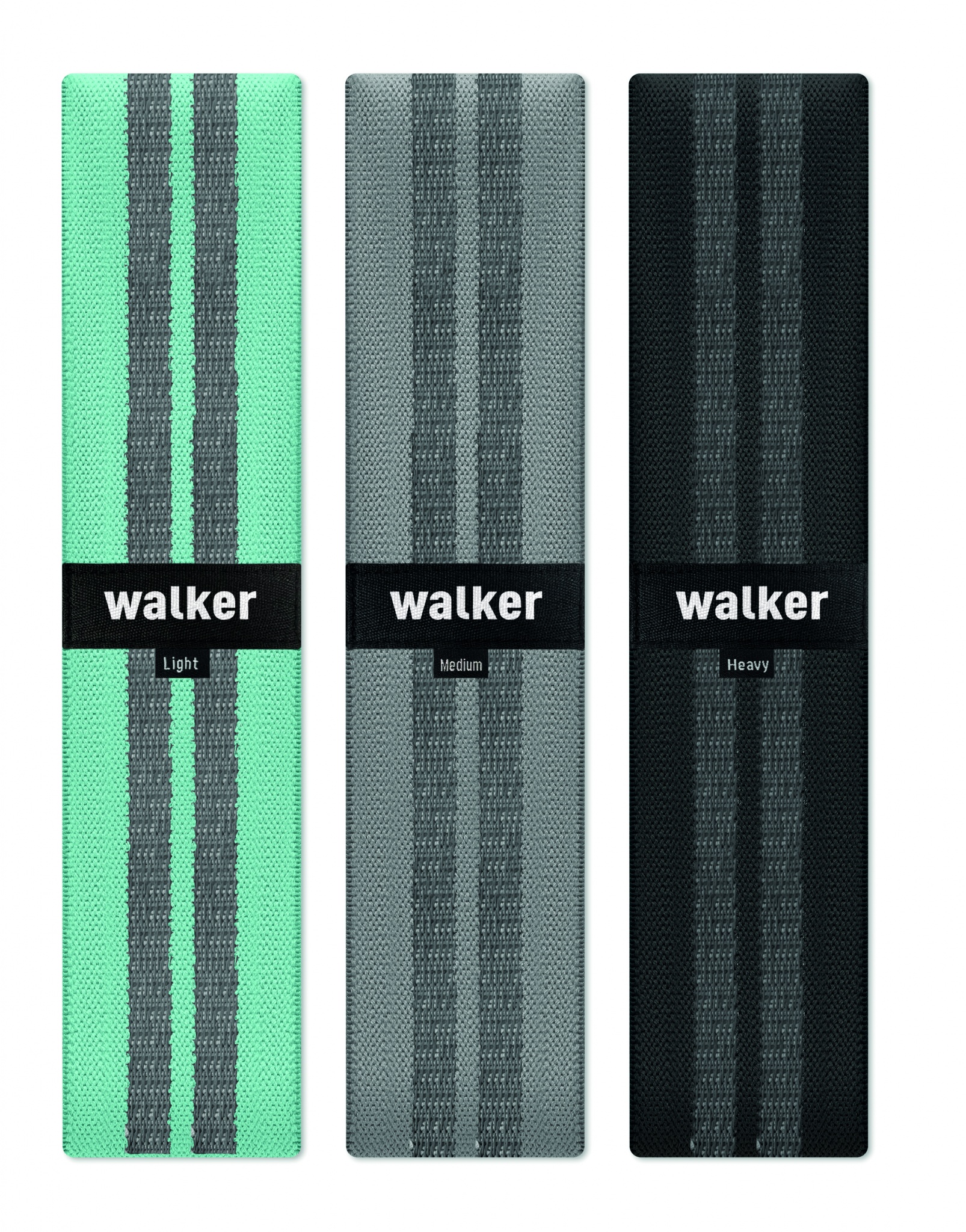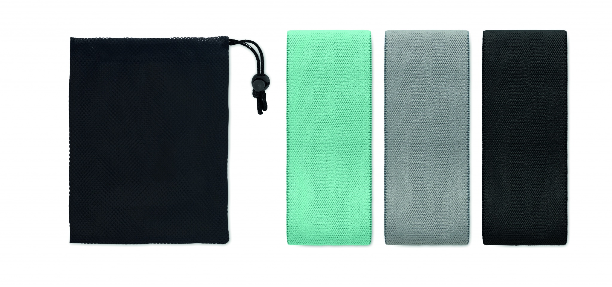 Set med 3 fitnessband i terylen, bomull och latexsilke i en RPET-påse. Fitnessbanden har alla olika styrka för optimal träning.