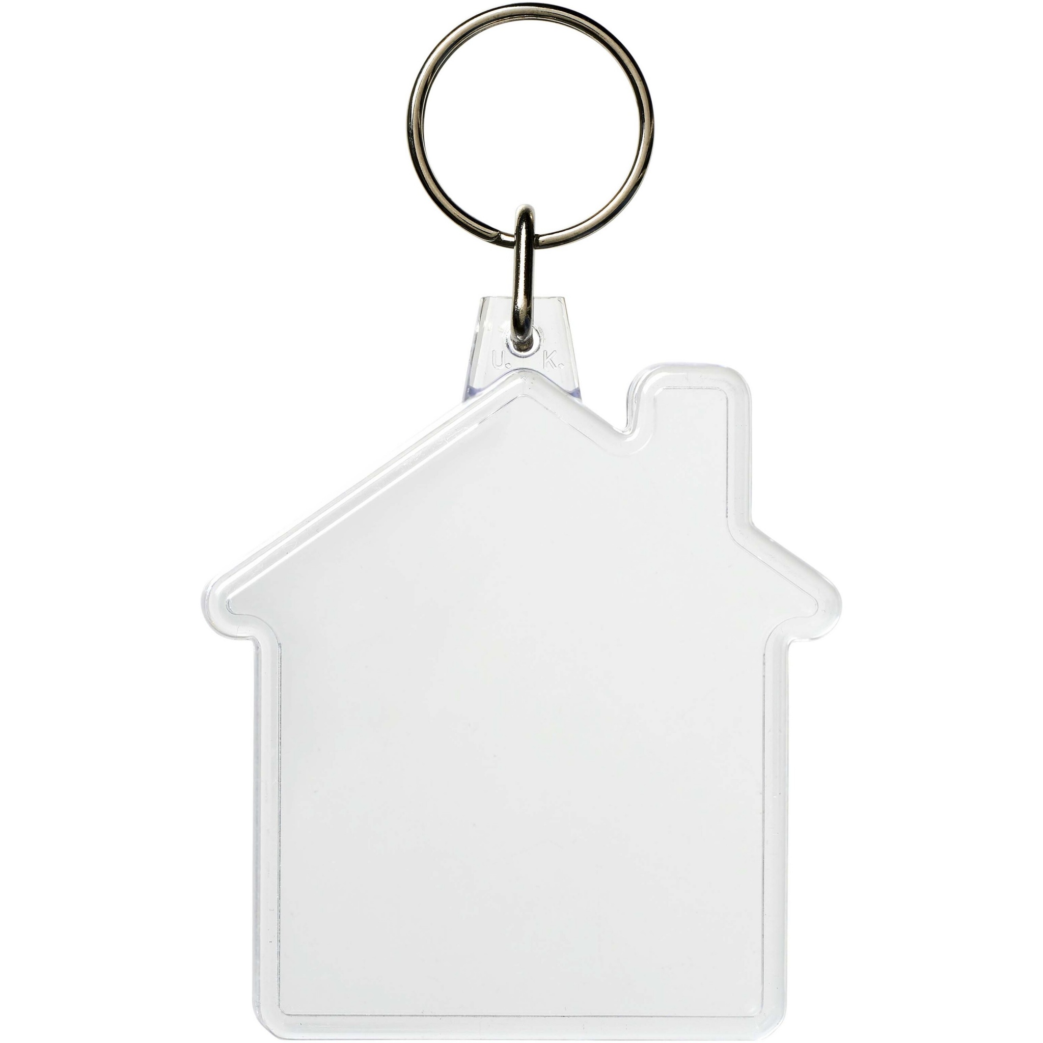 Combo husformad nyckelring. Genomskinlig husformad nyckelring med delad metallring. Metallringen har en platt profil som är idealisk för utskick. Tryckinläggets dimensioner: 5,9 cm x 5,6 cm. GPPS-plast.