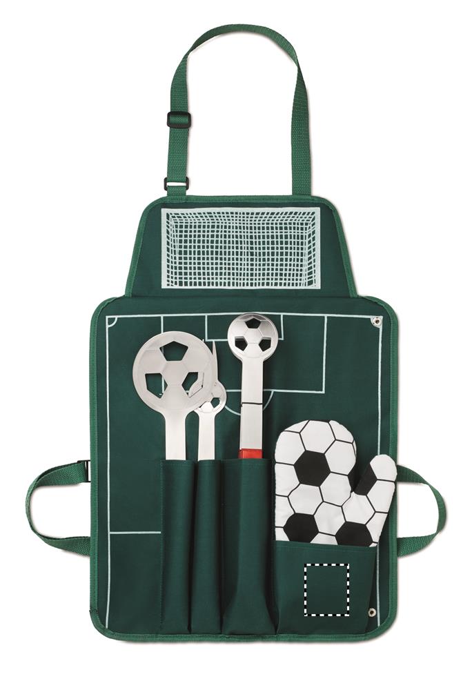 Grillförkläde set med fotbollstema. Tre olika verktyg och en handske. Förkläde är tillverkat i 600D polyester.