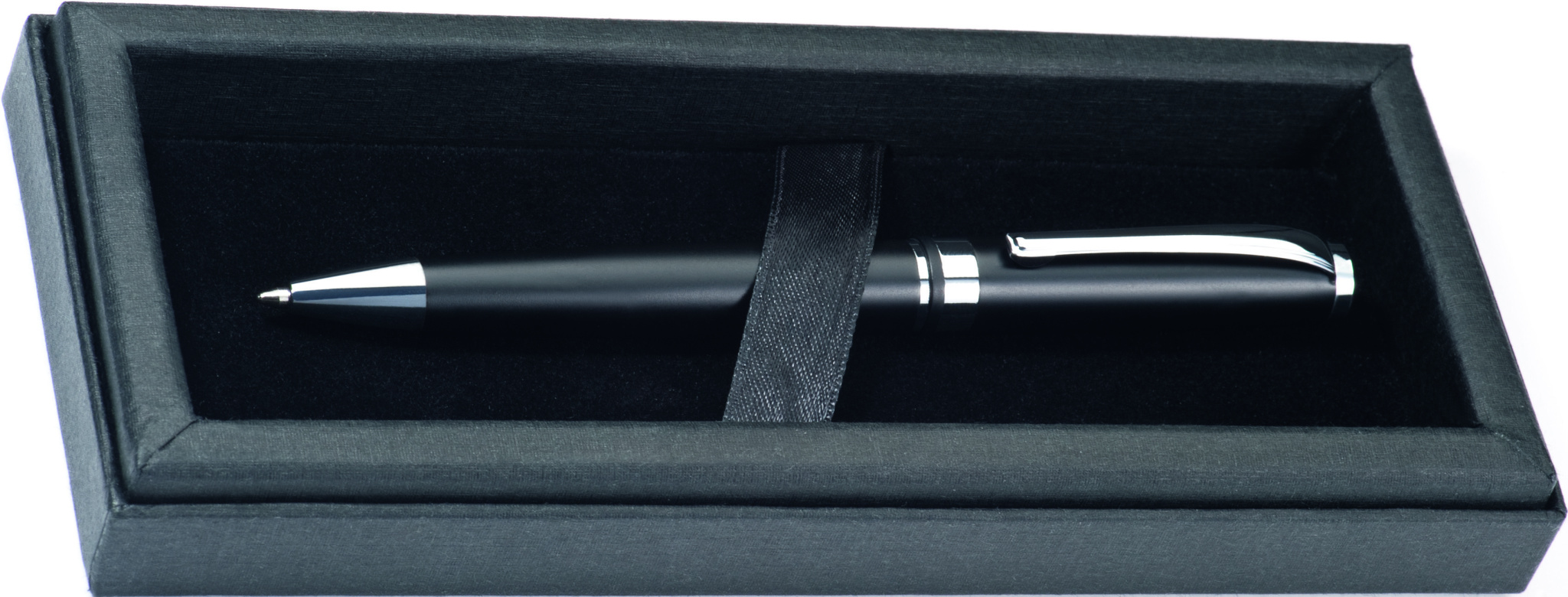 Högkvalitativ metallpenna i matt svart, med blanka silverapplikationer och elegant fodral. Vi kommer att gravera din logotyp under klippet.