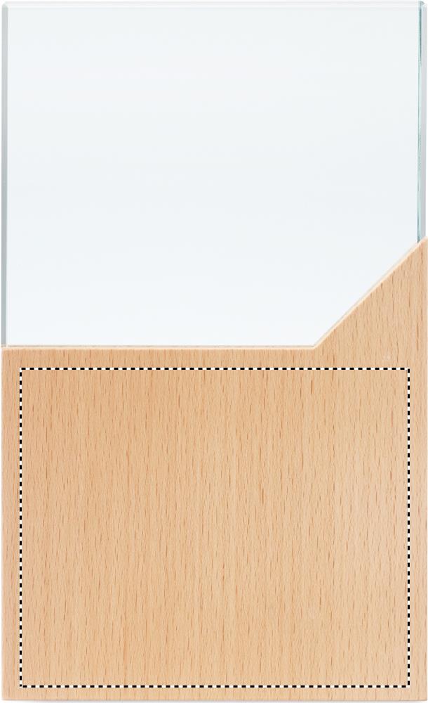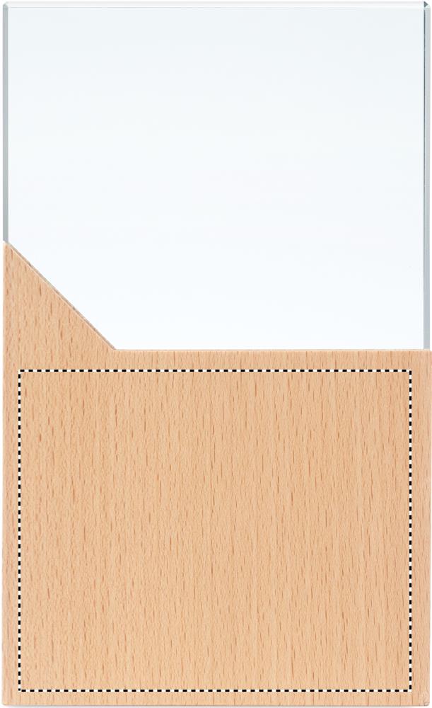 Pris- eller minnesplakett i kristall på en bas av bokträ i en presentförpackning.