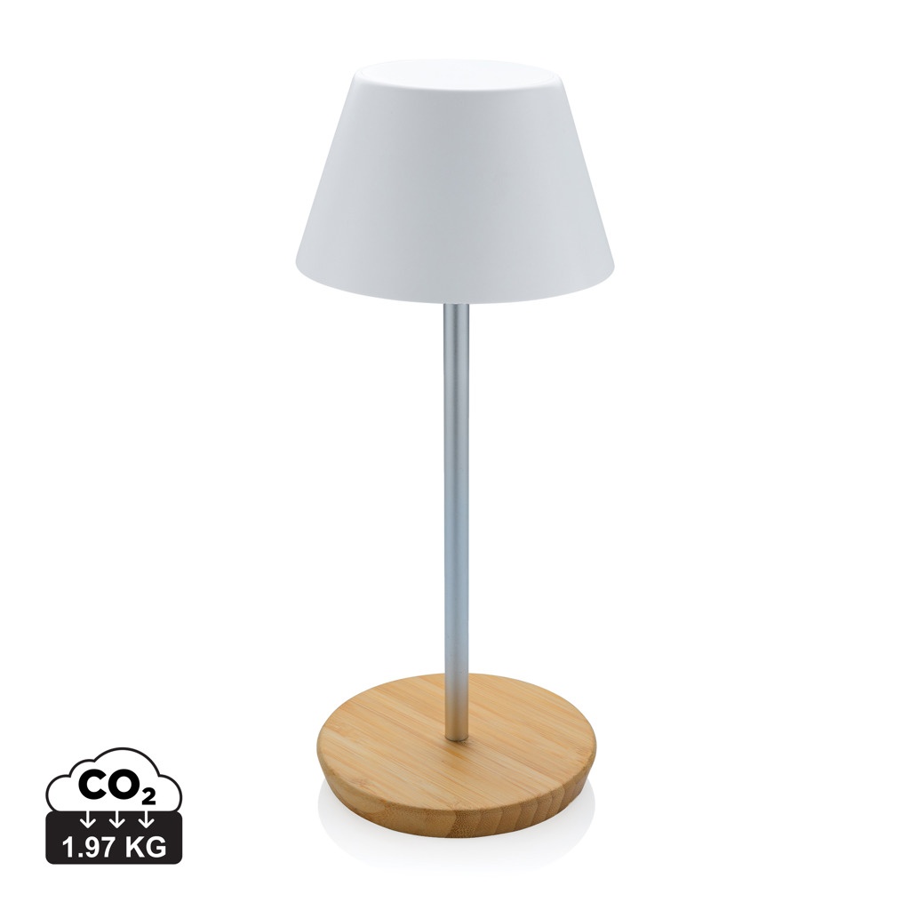 Lyxig bordslampa tillverkad av RCS-certifierad återvunnen ABS-plast, återvunnen aluminium och FSC-certifierad 100% bambu. Totalt återvunnet innehåll: 40% baserat på total produktvikt. RCS-certifiering garanterar en helt certifierad leveranskedja för de återvunna materialen. Bordslampan fungerar upp till 12 timmar på en enda laddning och kan laddas om på 2 timmar. Med ett 1.800 mAh-batteri av a-klass och type C-input ( 5V/1A) Med två lägen (varmt ljus och vitt ljus) som kan justeras med hjälp av en beröringssensor i basen. Uppladdningsbar via USB-C. IPX4 vattentät. Levereras i FSC® mix-förpackning.