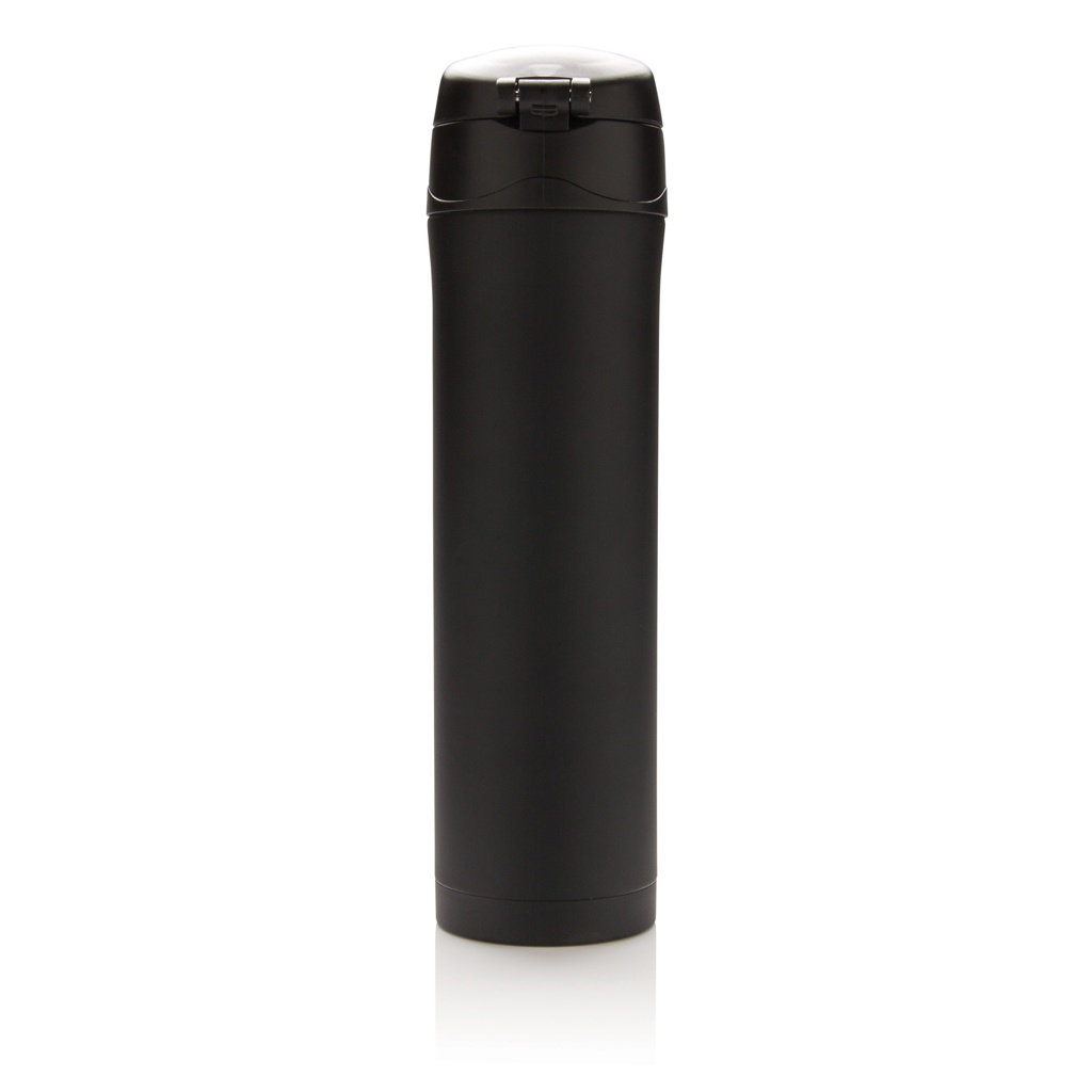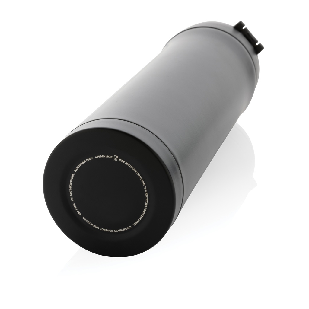 Dubbelväggig vakuumflaska i stainless steel håller din dryck varm upp till 5 timmar eller kyld upp till 15 timmar. Locket går att låsa och på så sätt undviker du spill och läckage. Locket är enkelt att rengöra för optimal hygien och kan diskas i maskin. Den unika designen gör det möjligt att dricka smidigt och säkert med en hand direkt från flaskan. Flaskans storlek passar nästan alla bilmugghållare. Tillverkad av RCS (Recycled Claim Standard) certifierade återvunna material. RCS certifiering säkerställer en helt certifierad leveranskedja av de återvunna materialen. Totalt återvunnet innehåll: 76% baserat på total produktvikt. BPA-fri. Volym: 450 ml. Levereras i FSC®-certifierad kraft förpackning.
